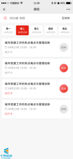 4.對應課程下方顯示學(xué)員的打卡結果、已打卡/未打卡狀態(tài)