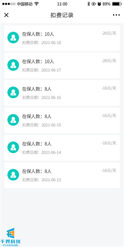 5.扣費記錄:用戶(hù)賬戶(hù)每天的所有在保人員扣費總金額流水列表展示