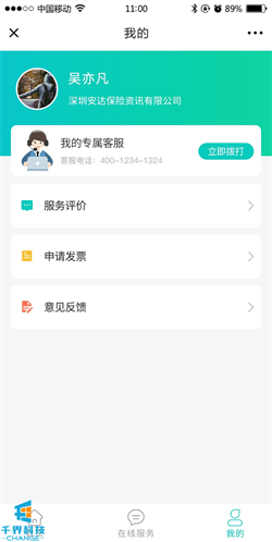 2.我的專(zhuān)屬客服:專(zhuān)屬客服電話(huà)展示,點(diǎn)擊可一鍵撥號
